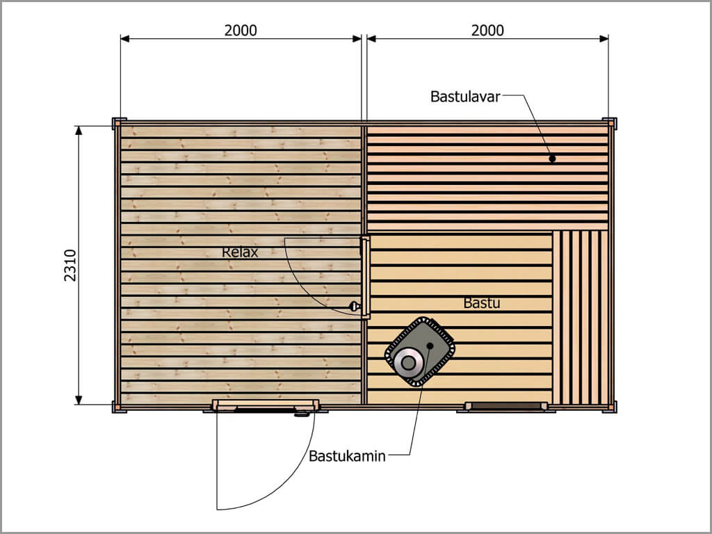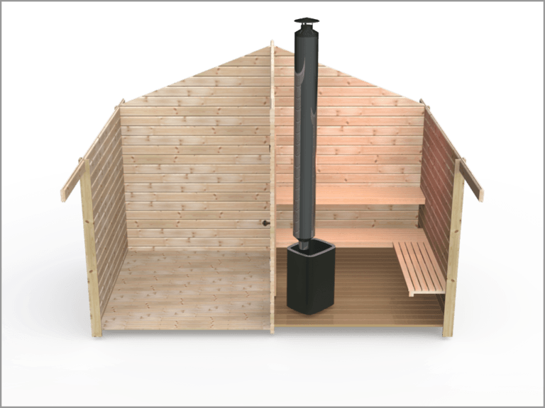 Det som inte ingår i våra monteringssatser är: kaminpaket, spik och skruv, isolering, Trycke och låscylinder, färdigt ytskikt på taket. Finns under Fliken Tillval Bastustugor eller skrolla längre ner på sidan.