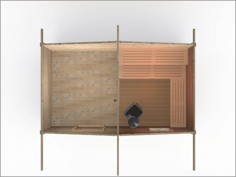 Bergön är en stuga i samma skal som modell: Sandskär, men med en nedre vinkellave där man får fler sittplatser i bastun.